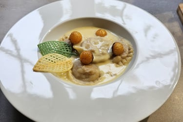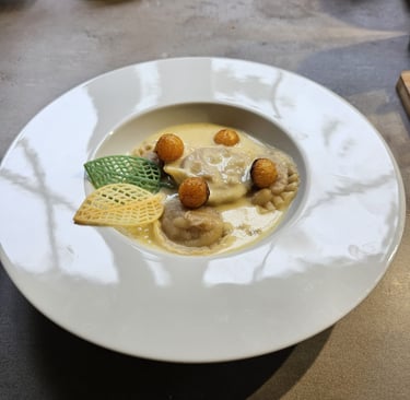 Pumpkin ravioli, roasted butternut balls with aged Comté cheese sauce