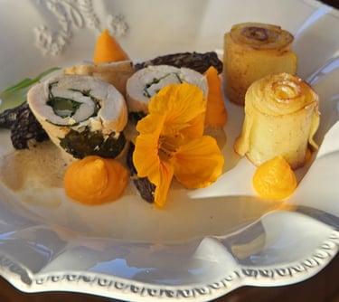 Jura chicken ballotines, Comté cheese, spinach, yellow wine sauce and morels