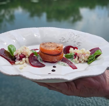 Gravlax trout, apple tartare, shallots, lemon cream sauce with roasted beetroot purée
